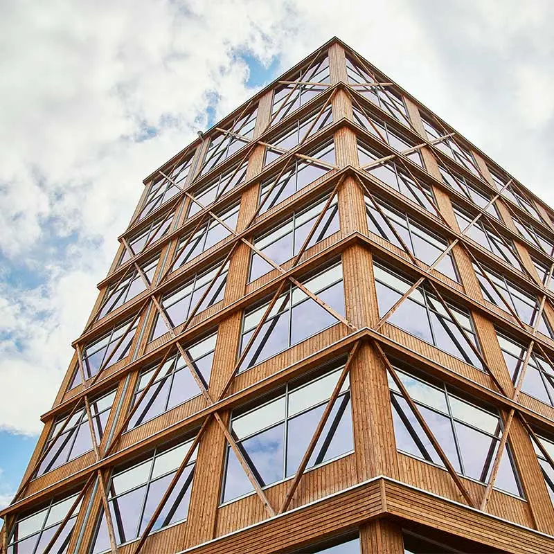 Vi har 2 760 kubikmeter trä i stommen, det binder 1 860 000 ton CO2 och sparar mycket jämfört med en traditionell konstruktion.