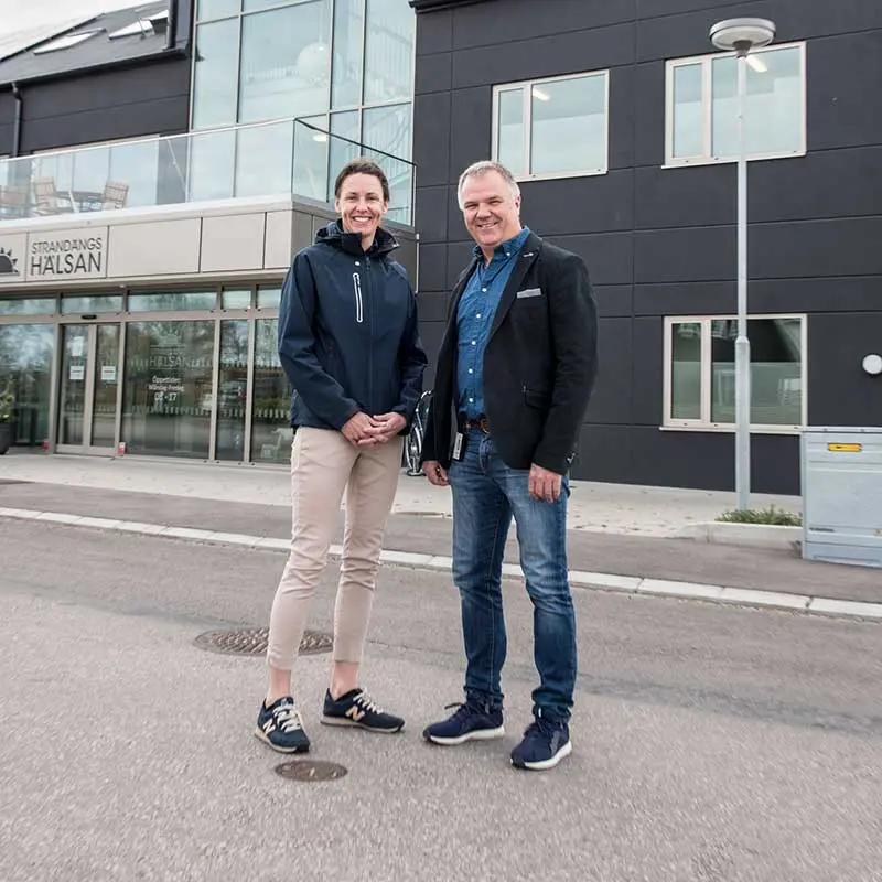 När lokalerna blev för små förverkligade de sin dröm om att bygga nytt. De fastnade för Allarp, ett expansivt område som väntas bli en unik miljösatsning där kommun och näringsliv samverkar för ett hållbart samhälle. Malin och Jesper är båda läkare och startade egen vårdcentral i Mellbystrand 2015. Sen ett år tillbaka har de sin verksamhet i en modern falusvart byggnad granne med naturen och havet.