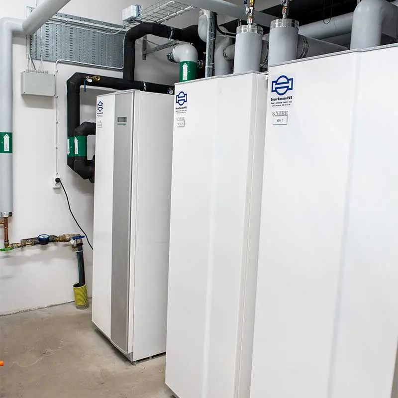 - Bergvärme med frikyla: 1 st NIBE F1345-40, 4 borrhål som är vardera 200 m djupa