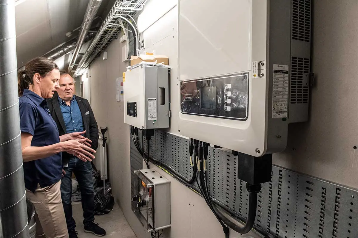 Malin och Jesper ser över sitt nya smarta solsystem som både värmer och kyler ner fastigheten.